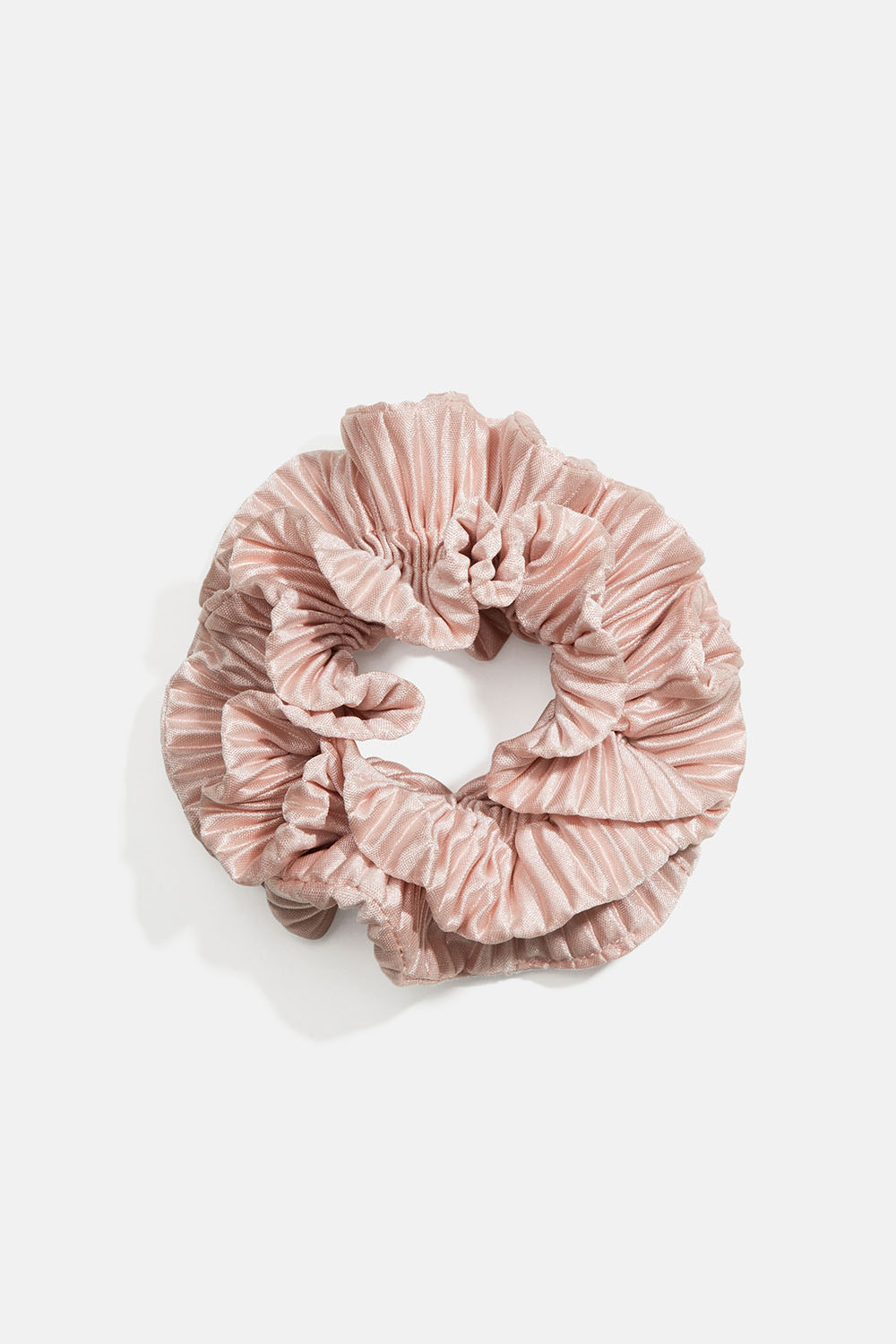 Plisserad scrunchie i glansigt rosa tyg med tre dekorativa volanger som ger härlig volym.