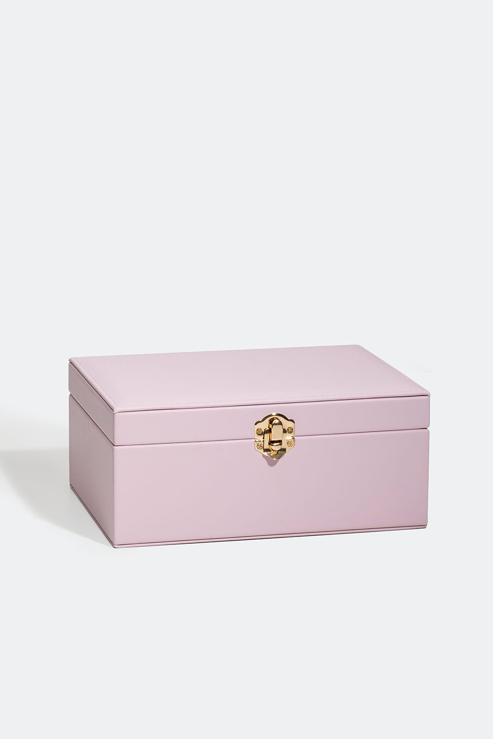 Stilrent smyckeskrin i rosa läderimitation, med ett guldigt lås och en insida i sammetsimitation. Skrinet är uppdelat i två våningar och har flera fack i olika storlekar för smart förvaring av flera olika smycken.