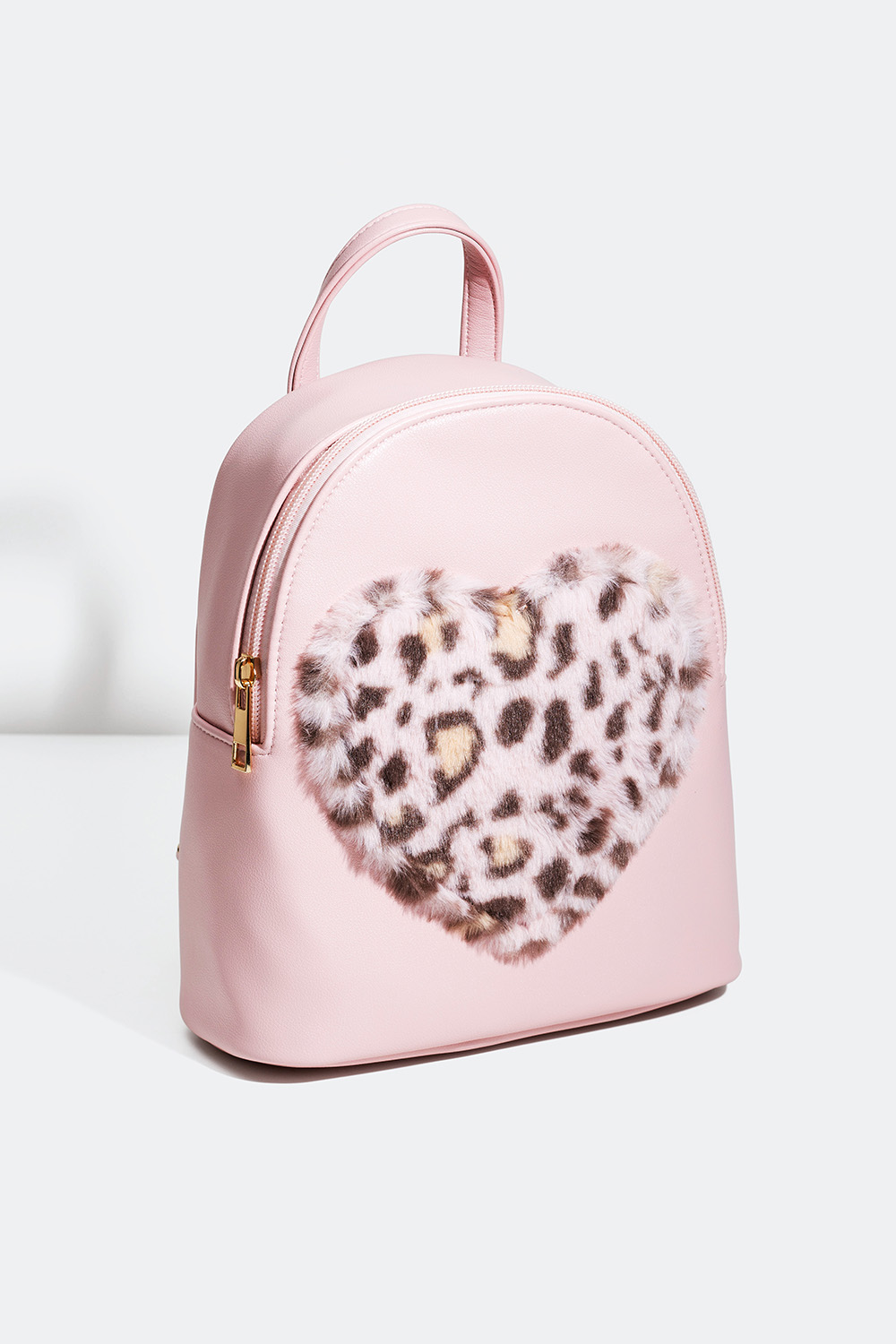 Ryggsäck med hjärta - Mindre ryggsäck för barn i konstläder. Ryggsäcken är dekorerad med ett hjärta i mjuk fuskpäls och består av ett stort fack som stängs med dragkedja. Ryggsäcken har axelband och handtag.