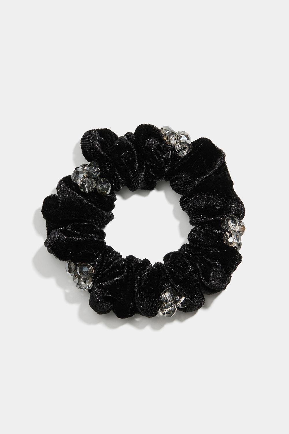 Scrunchie i svart sammet dekorerad med grå transparenta plastpärlor.