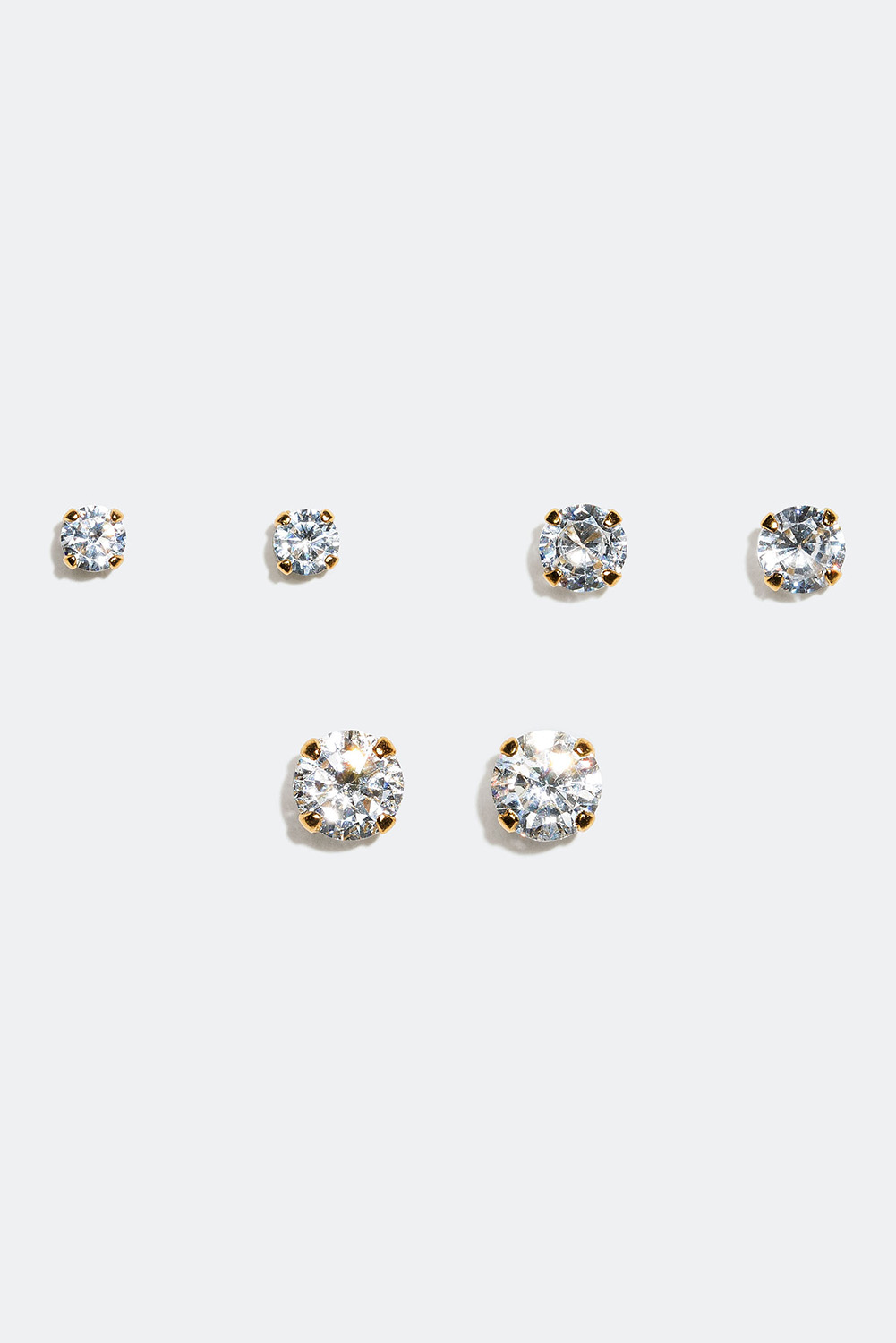 Studs med runda glasstenar, förgyllda med 18K guld, 3-pack, 4 mm