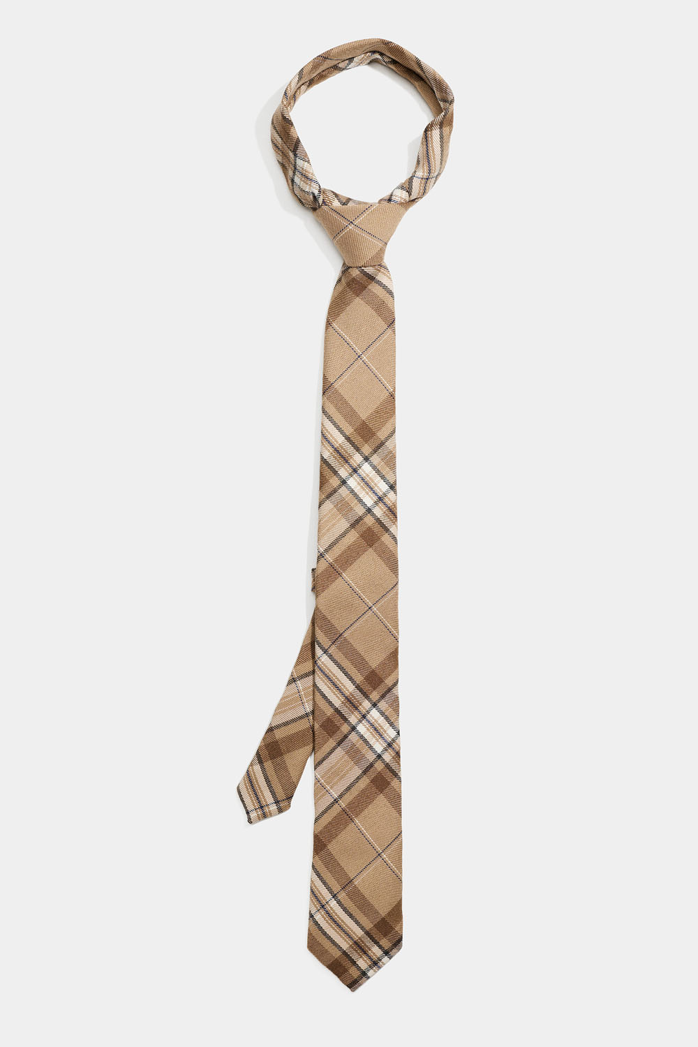 Slips i beiget rutigt tyg. Slipsen är färdigknuten och är enkel att justera i storlek.