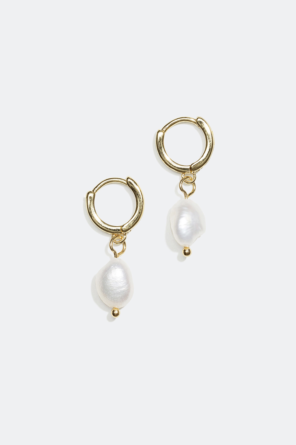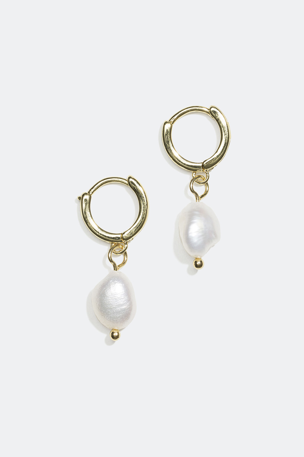 Små creoler i metall som är dekorerade med skimrande plastpärlor i asymmetrisk form som hängen.