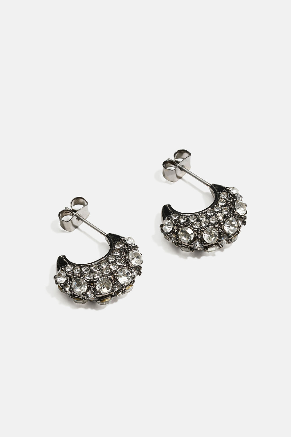 Små hoops i grå gun metal färg dekorerade med vita glasstenar i olika storlekar.