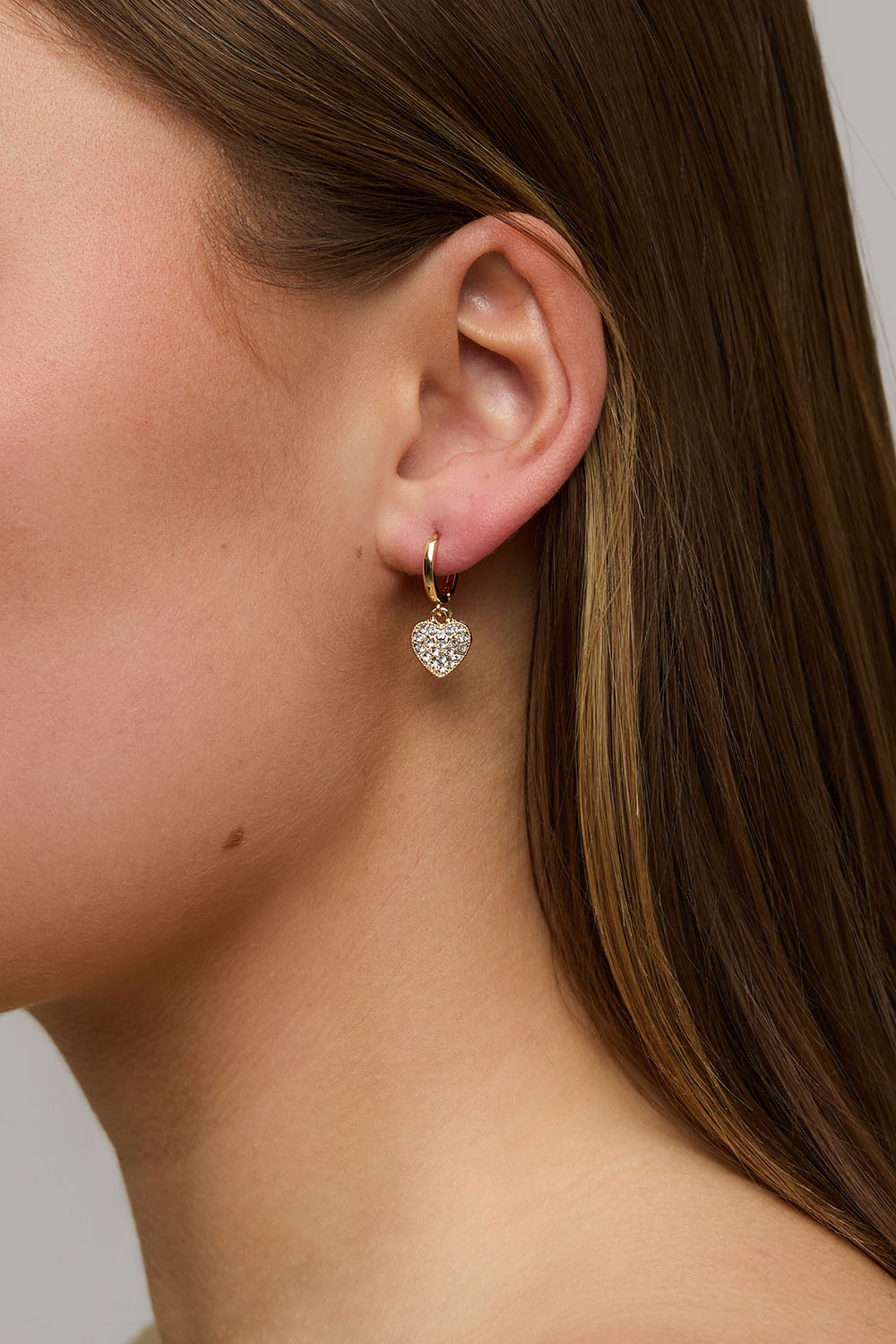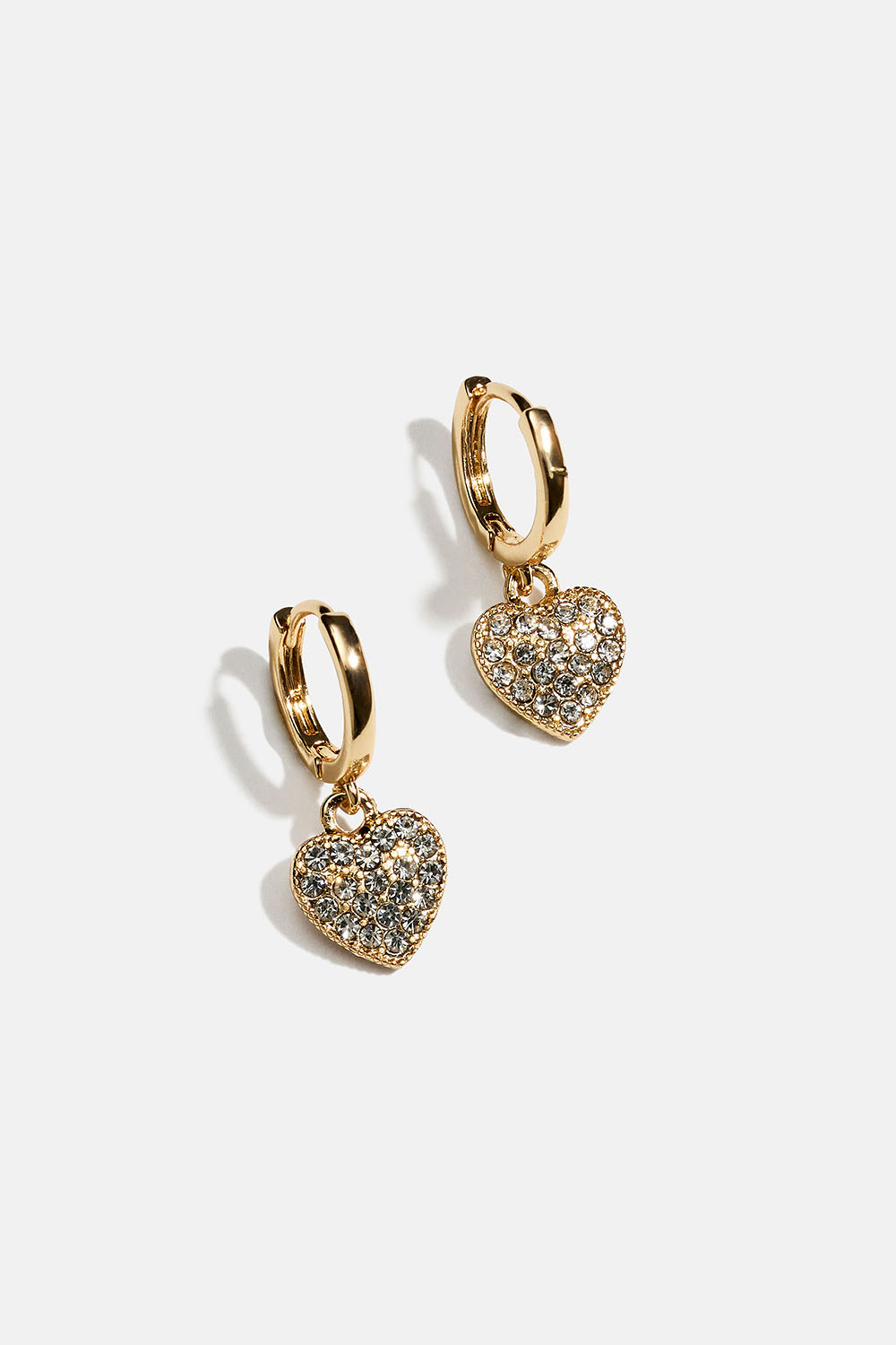 Små hoops i guldfärgad metall med hängen av hjärtan med skimrande glasstenar.