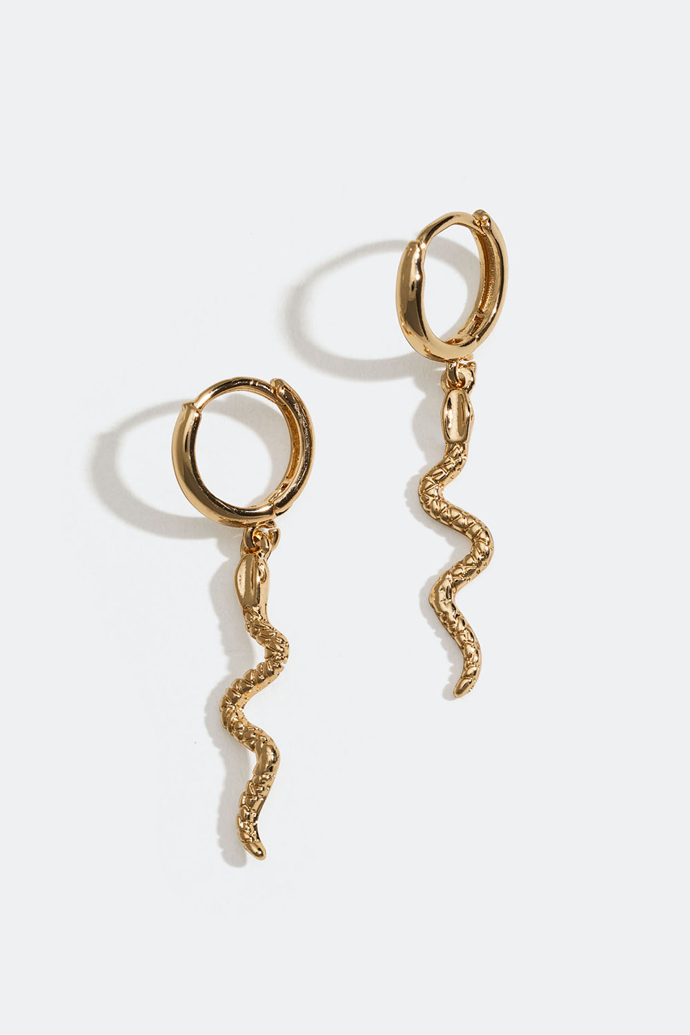 Små hoops i guldfärgad metall med hängen av dekorativa ormar.