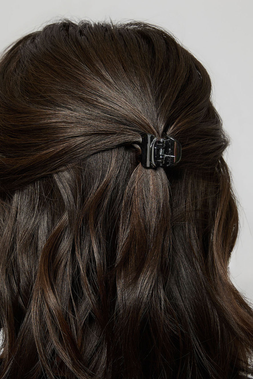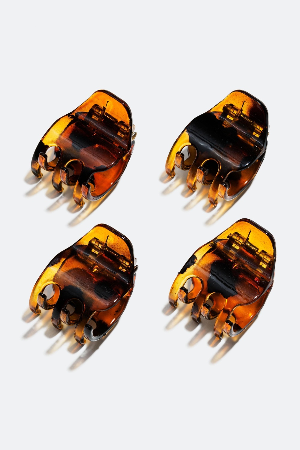 Små hårklämmor i 4-pack som är tre centimeter breda och gjorda i plast. Hårklämmorna kommer i färgerna svart, transparent och sköldpaddsmönstrad.