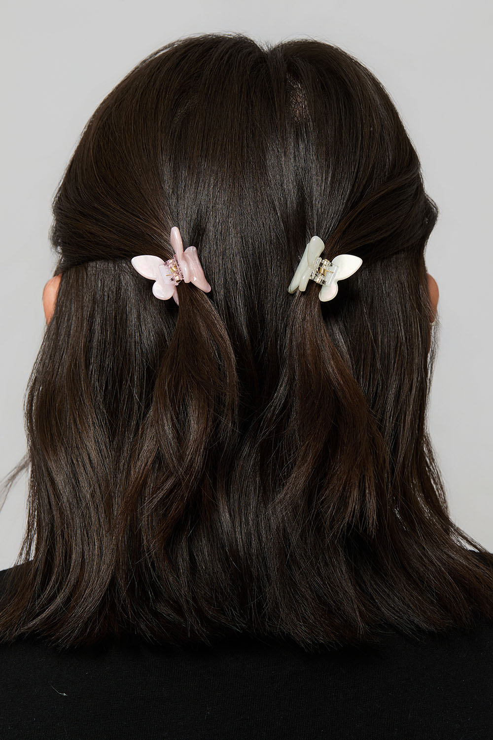 4-pack med små hårklämmor med rosa och vita fjärilar med skrimrande design.
