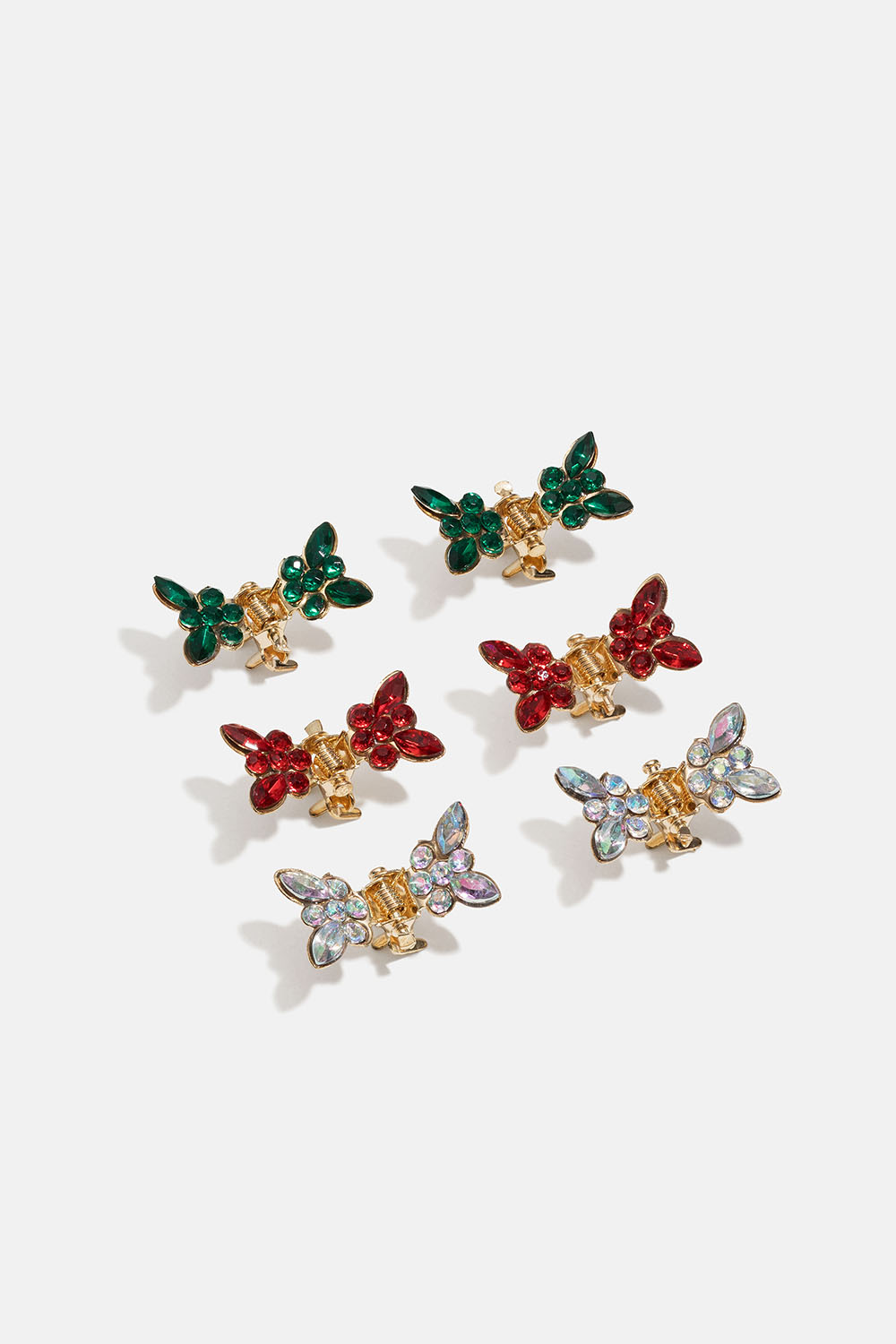 Små hårklämmor med strass i grönt, rött och vitt formade som fjärilar. Kommer i 6-pack