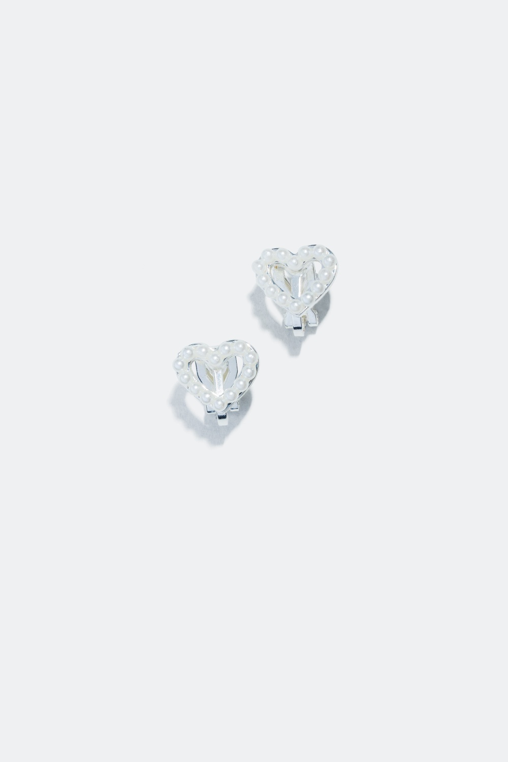 Söta små hjärtformade clipsörhängen dekorerade med färgade plastpärlor. Kommer i färgerna blå, vit och rosa.
