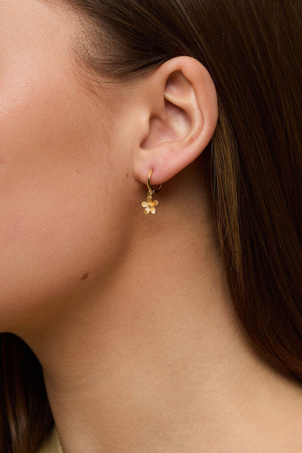 Små hoops i 18k guldpläterat äkta silver med hängande blommor med texturerade blommor.