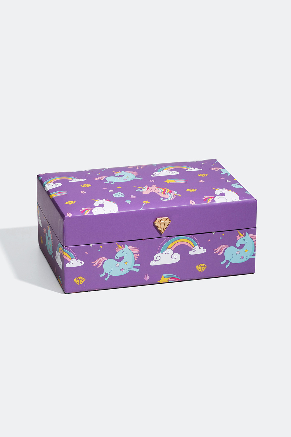 Lila smyckeskrin med mönster av enhörningar, regnbågar, stjärnor och diamanter i pastellfärger. Smyckeskrinet har ett guldfärgat diamantformat spänne och består av ett stort fack, en uttagbar hylla med två mindre fack samt ringförvaring och en spegel i locket.
