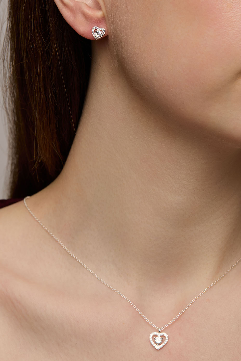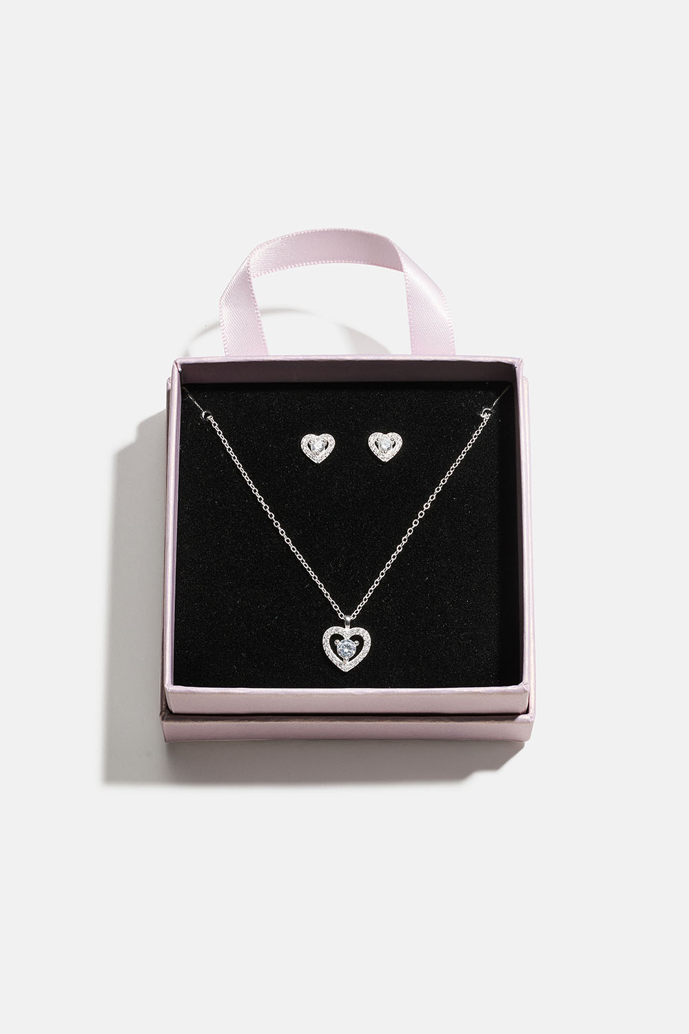Smyckessetet består av ett par studs med hjärtan med Cubic Zirconia och ett halsband med hjärthänge och Cubic Zirconia i äkta silver, fint förpackade i en rosa presentask med dyna i svart velour.