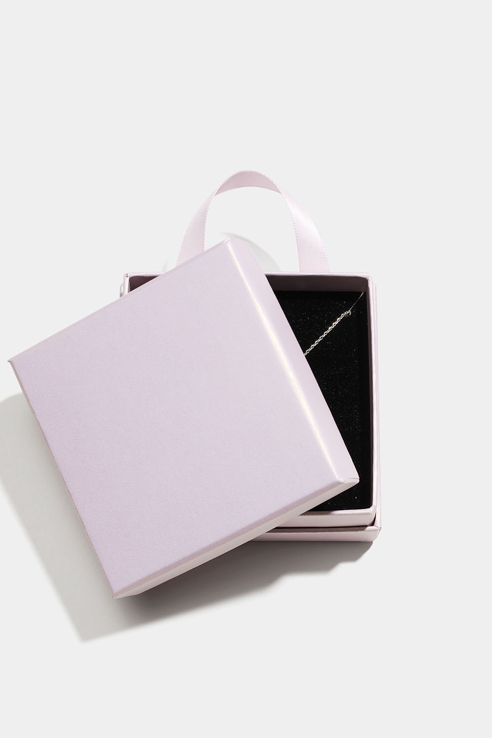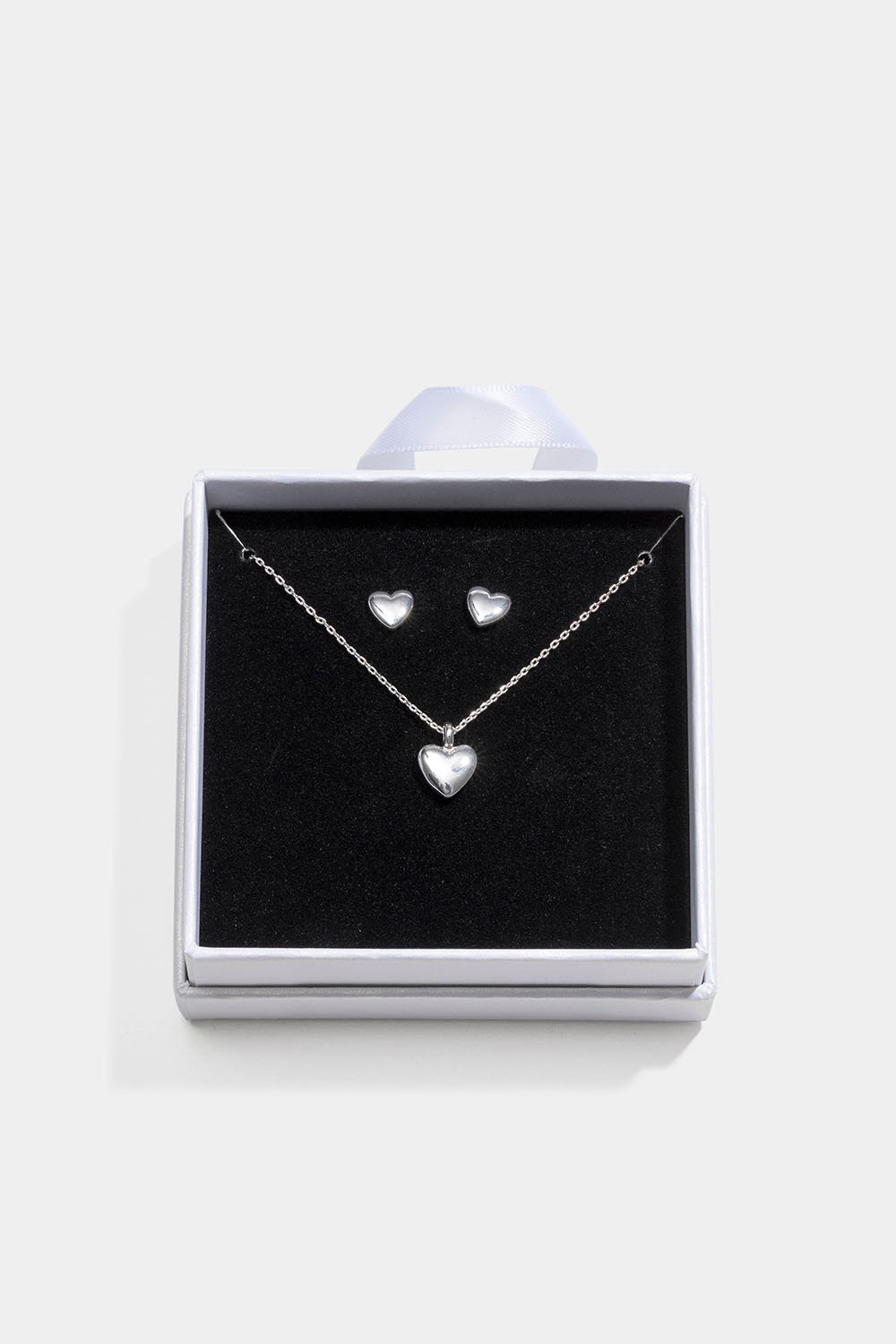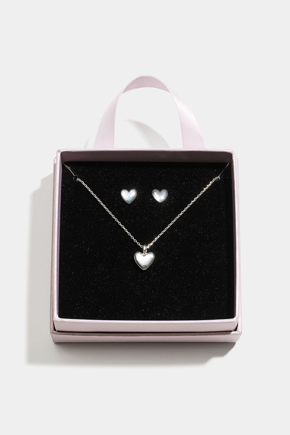 Smyckessetet består av ett par silverfärgade studs med hjärtan och ett silverfärgat halsband med hjärthänge, fint förpackade i en vit presentask med dyna i svart velour.