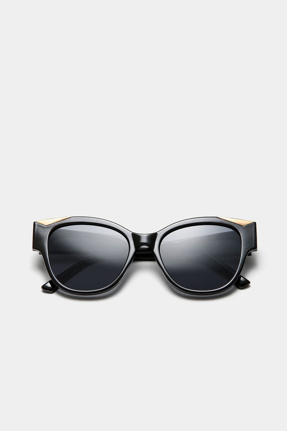 En klassisk solglasögon-modell i svart, med trekantiga, guldfärgade detaljer upptill på bågarna.