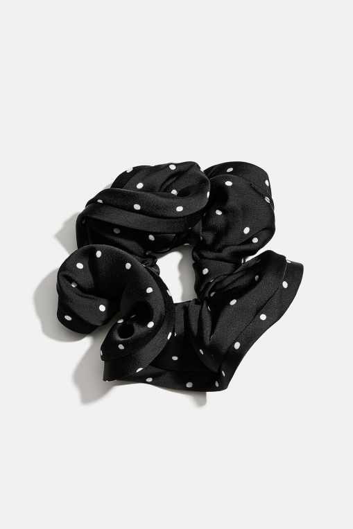 Stor scrunchie i svart sidenimitation med vita prickar.