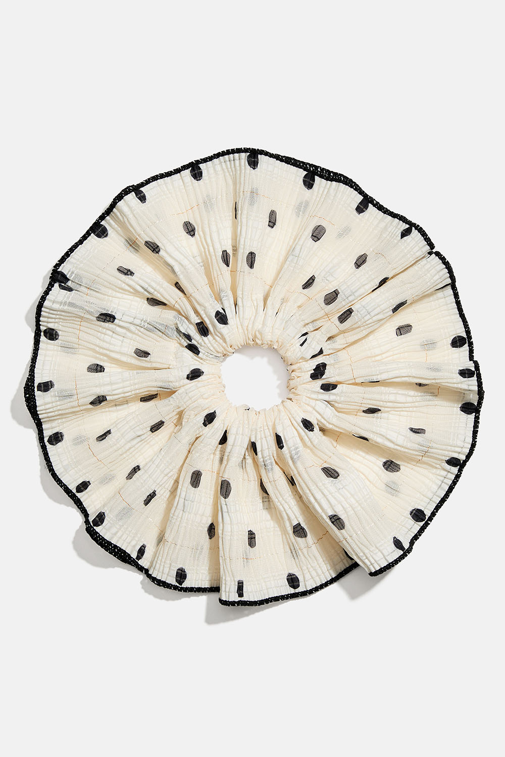 Stor vit scrunchie med plisserat tyg med svarta prickar och kant.