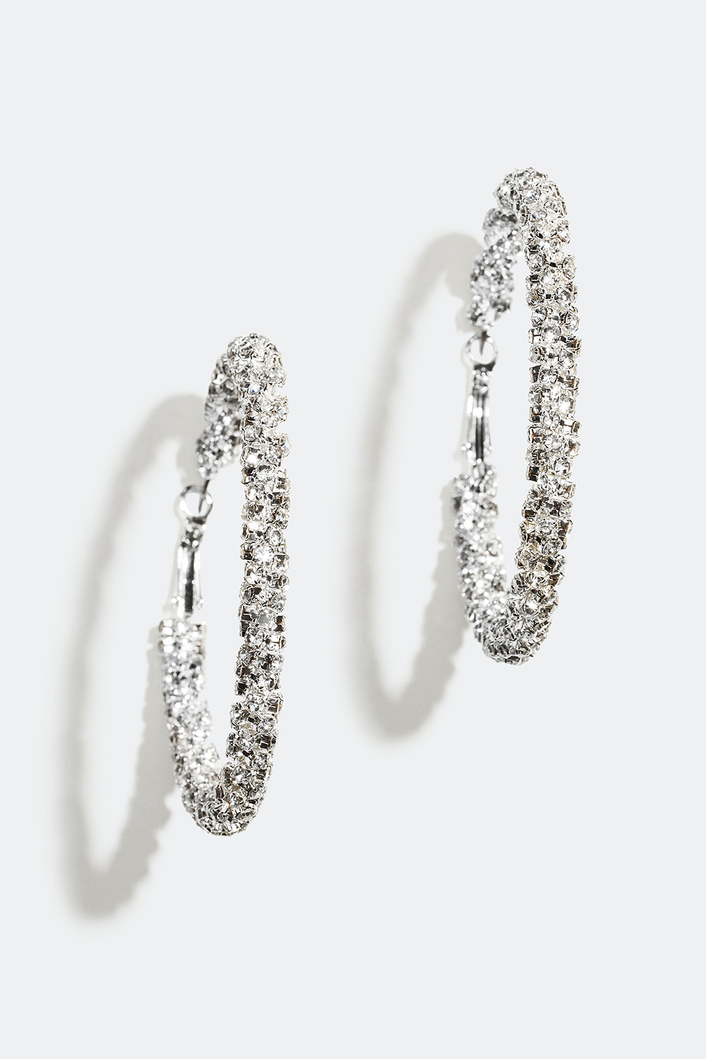 Stora hoops i silverfärgad metall som är dekorerade med skimrande glasstenar i en tvinnad design. Ett par glänsande örhängen som är perfekta att använda om du enkelt vill klä upp en festoutfit.