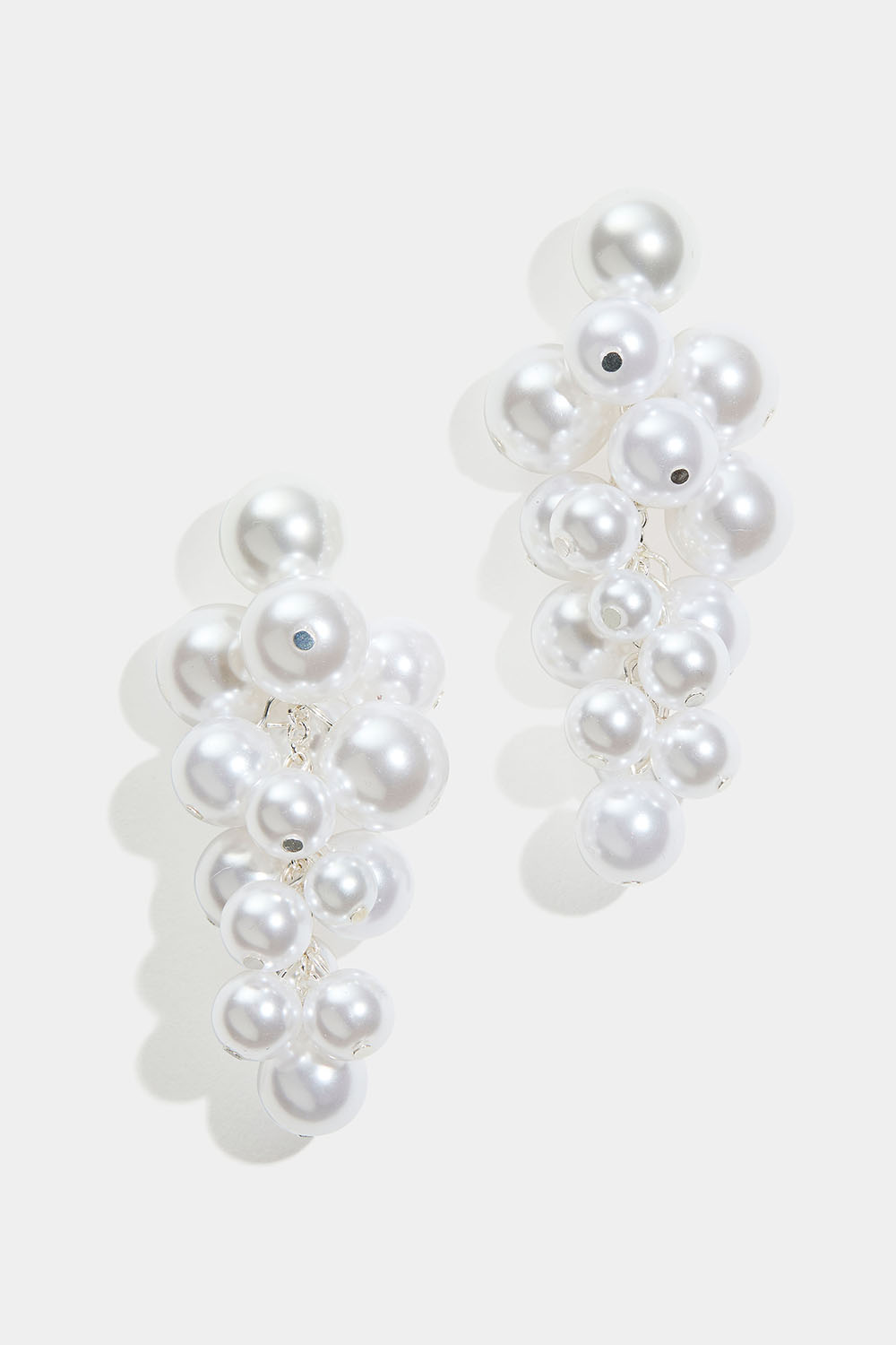 Stora örhängen med vita pärlor i olika storlek fästa på en silverfärgad metallkedja.