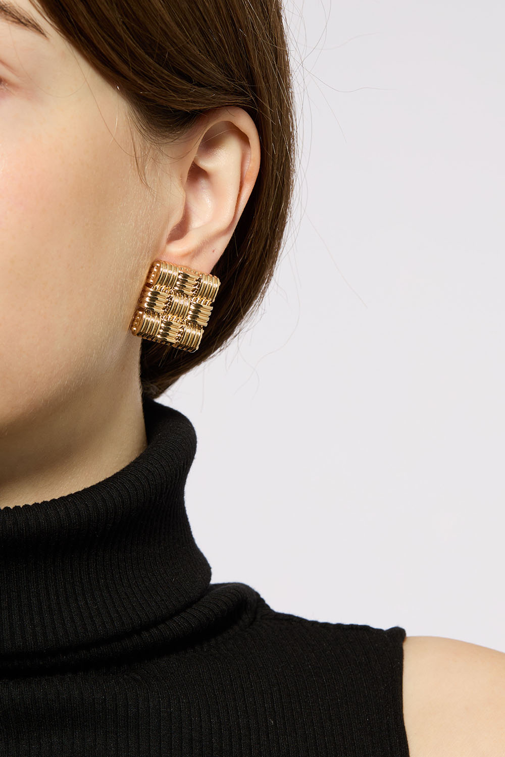 Studs i silverfärgad metall i kvadratisk form med flätat mönster och räfflad textur.