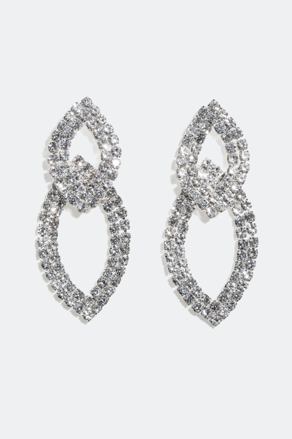 Strassörhängen med två dekorationer - Dessa stilrena örhängen består av en mindre samt en större dekoration som är sammansatta i varandra. Örhängena är utsmyckade med kristallfärgade glasstenar vilka ger örhängena ett fint skimmer.