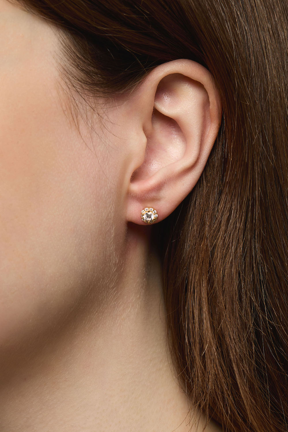 Små runda studs i 18k guldpläterat äkta silver utsmyckade med en större Cubic Zirconia sten och små Cubic Zirconia stenar som är placerade runt om. Ett par enkla men skimriga örhängen som passar till flera olika tillfällen.