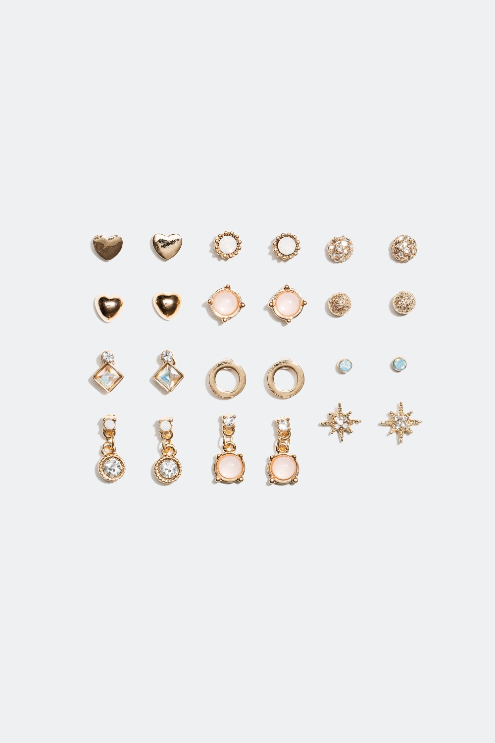 12 par örhängen i guldfärgad metall i olika former såsom cirklar, stjärnor, kulor, blommor. Några är dekorerade med glasstenar i rosa eller transparent.