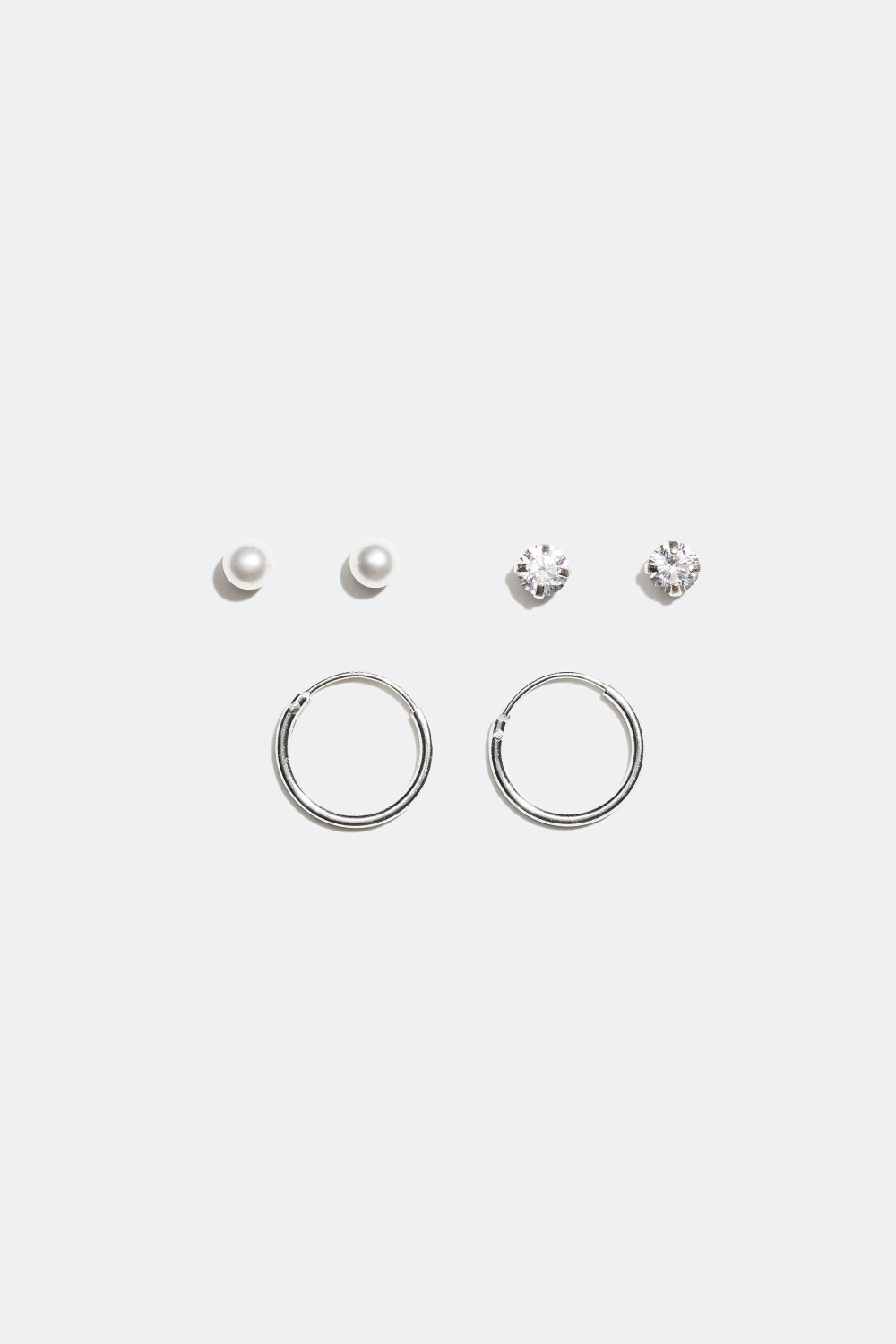 3-pack örhängen i äkta silver innehållande två studs där det ena paret är dekorerade med skimrande glasstenar i Cubic Zirconia och det andra med små vita pärlor i plast samt ett par små creoler i med slät yta.