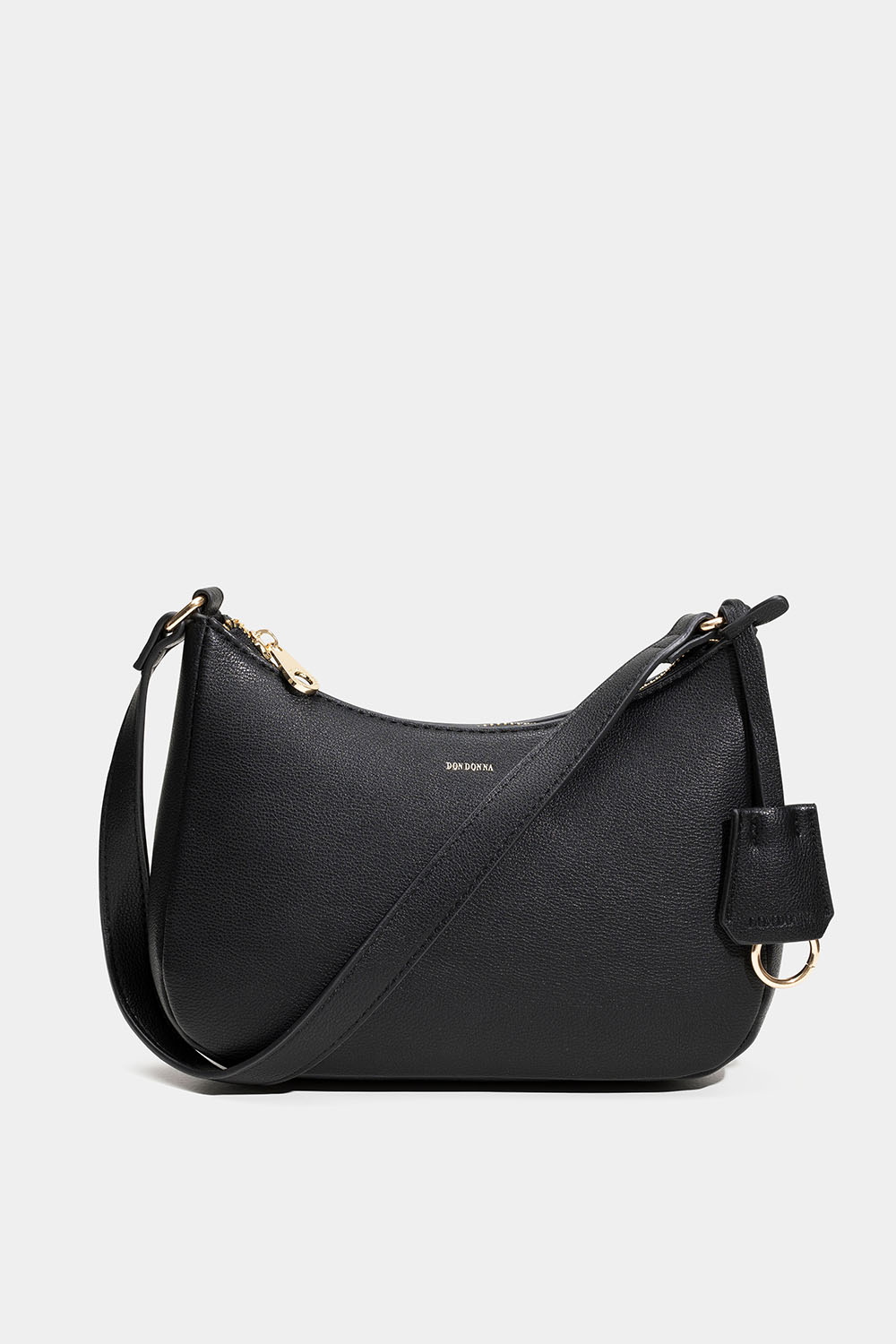 Liten svart baguetteväska från Don Donna. Väskan har en axelrem och stängning med dragkedja, samt två innerfack varav en med dragkedja. Det medföljer även en avtagbar nyckelring.