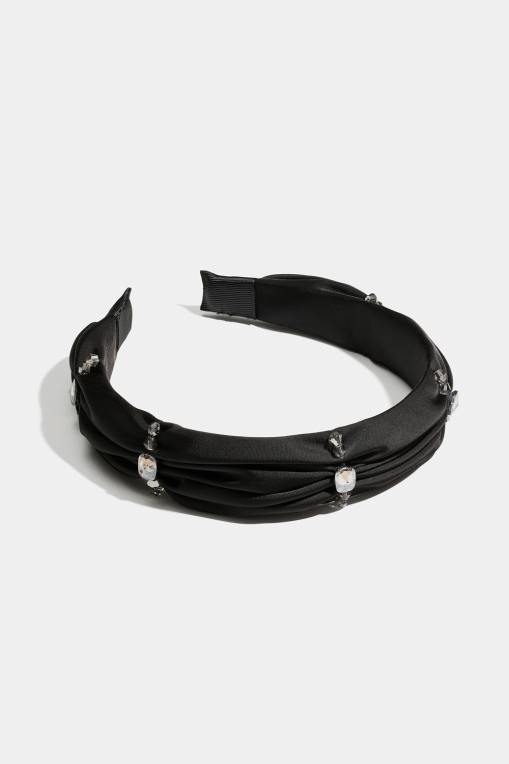 Diadem i svart rynkat tyg dekorerat med transparenta pärlor.