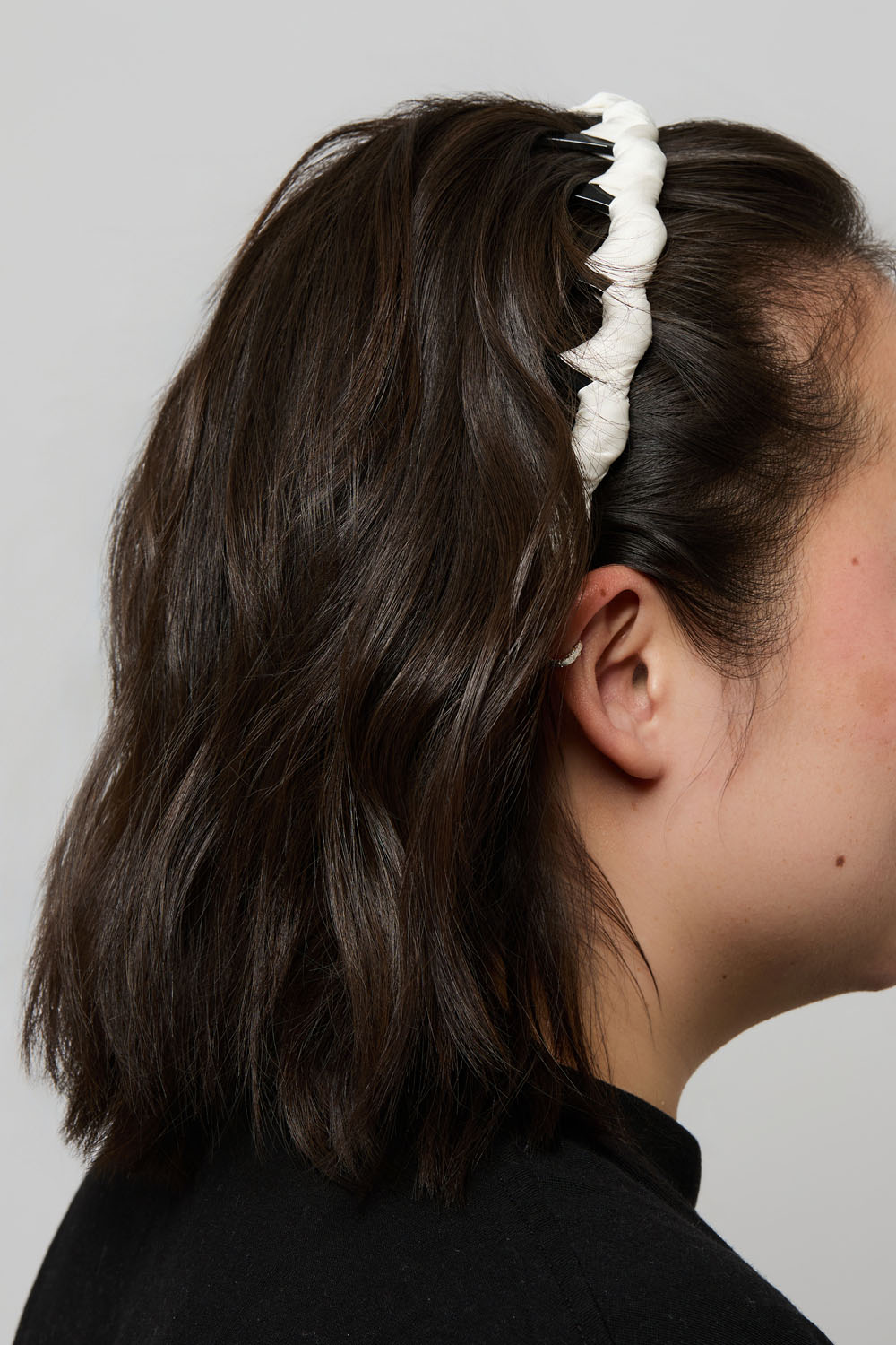 Svart diadem i plast med taggar som är dekorerad med svart sidenimiterat tyg lindat runt.
