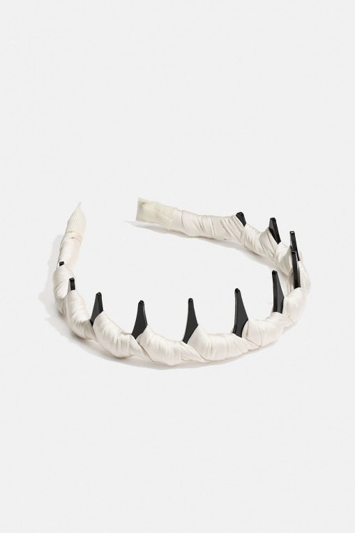 Svart diadem i plast med taggar som är dekorerad med vitt sidenimiterat tyg lindat runt.
