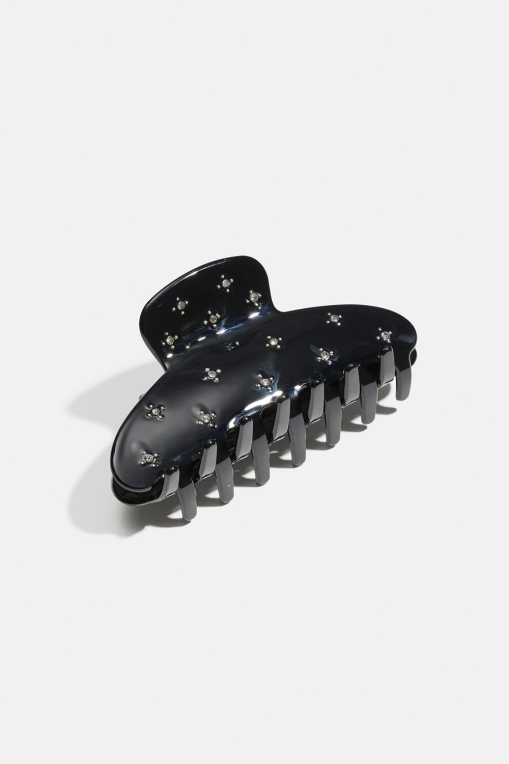 Svart hårklämma i klassisk form dekorerad med små vita glasstenar.