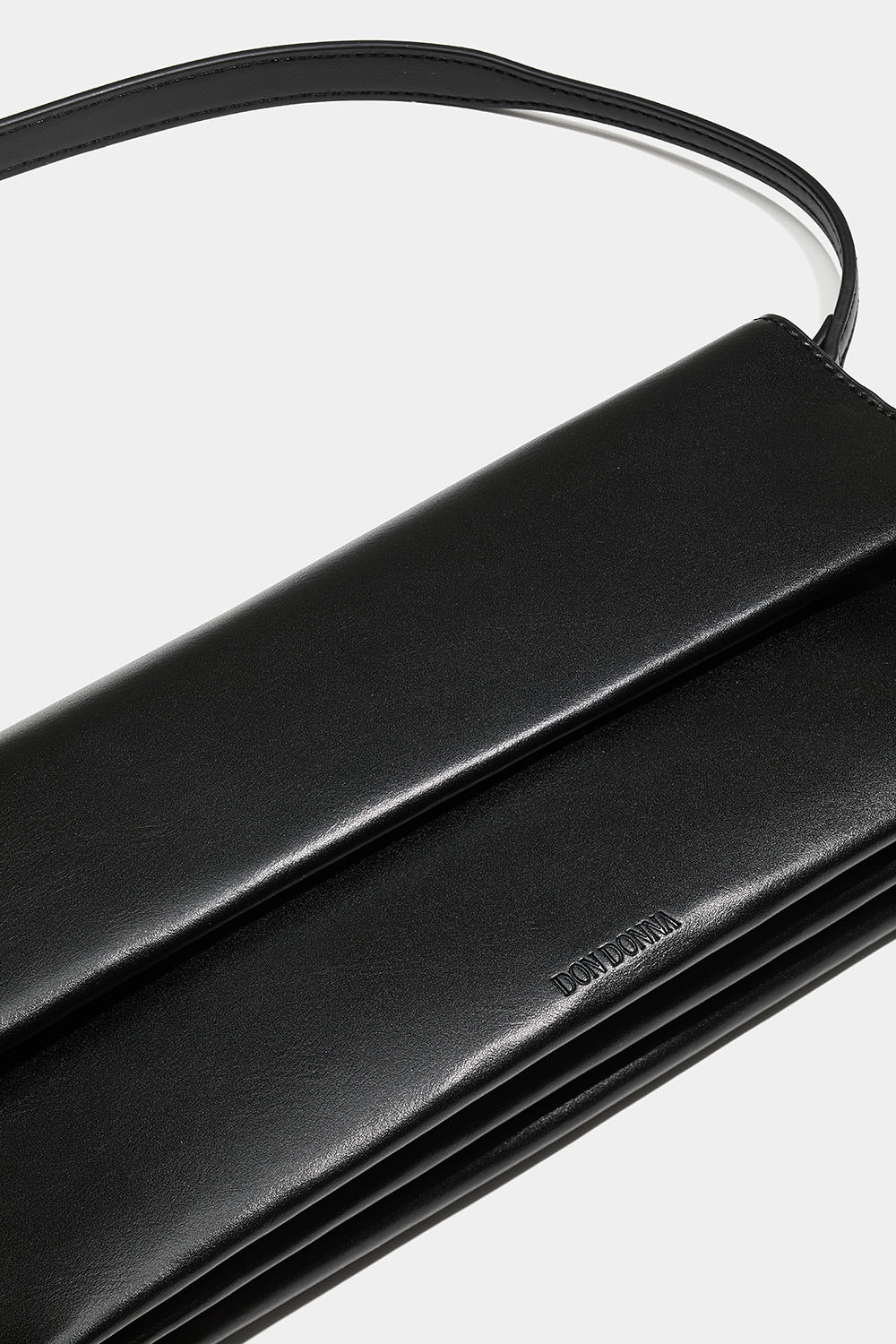 Svart kuvertväska i imitationsläder med en präglad liten Don Donna logga. Väskan stängs med magnet och har tre fack på insidan, en som stängs med dragkedja. Det medföljer en avtagbar axelrem.
