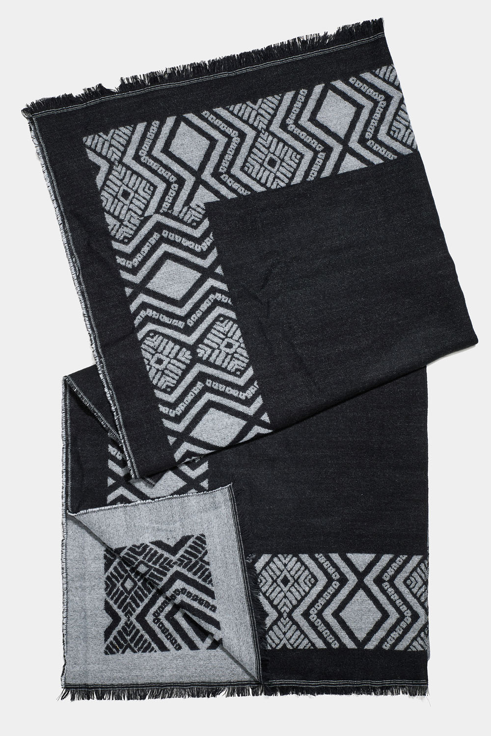 Svart poncho med grått mönster och fransar.