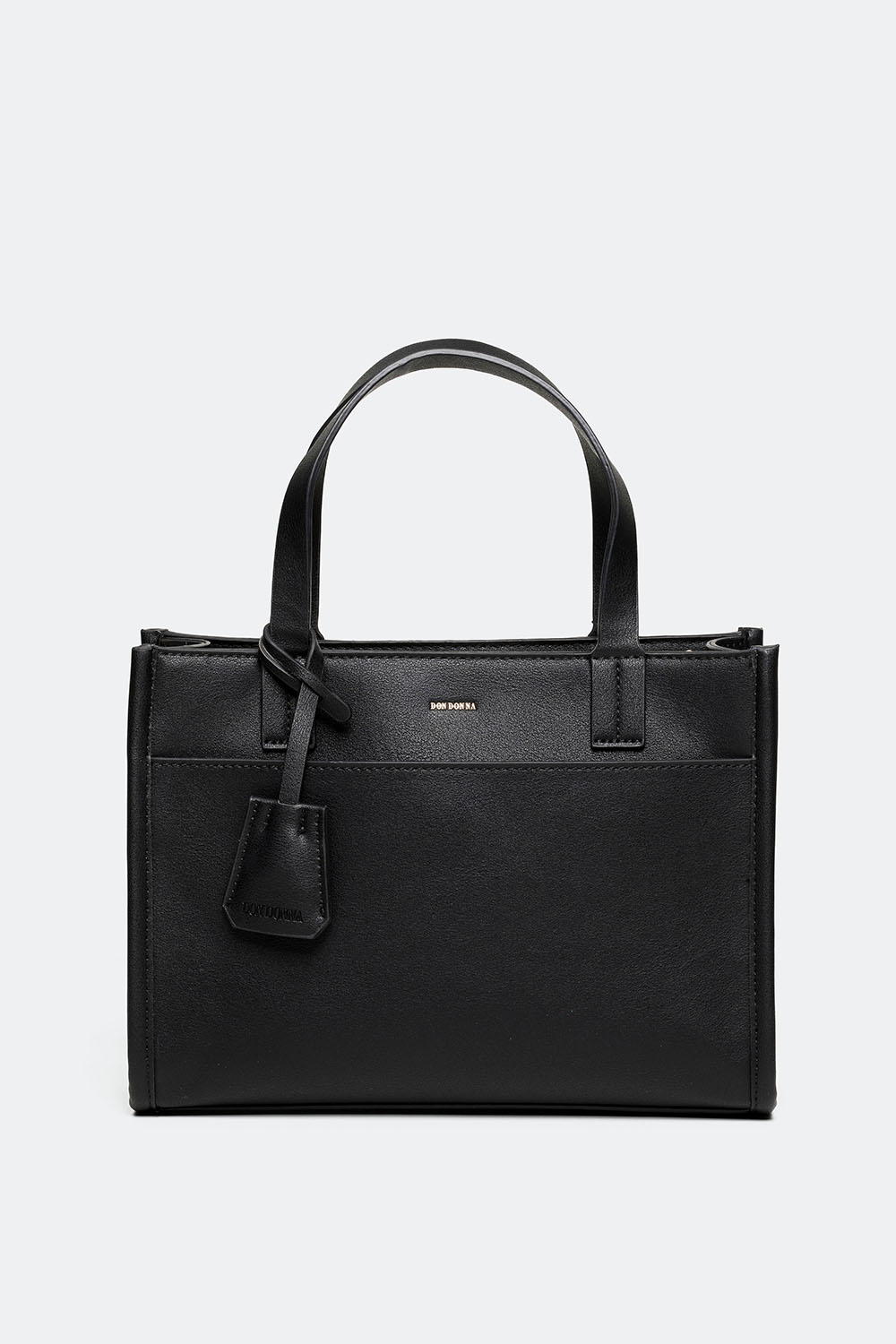 Svart väska med guldfärgad Don Donna-logga framtill. En stilren väska som kommer med två handtag och en avtagbar axelrem. Väskan har ett större fack som stäng med dragkedja och två mindre fack inuti. Axelremmen är avtagbar och justerbar, så att man även kan bära väskan som crossbody.