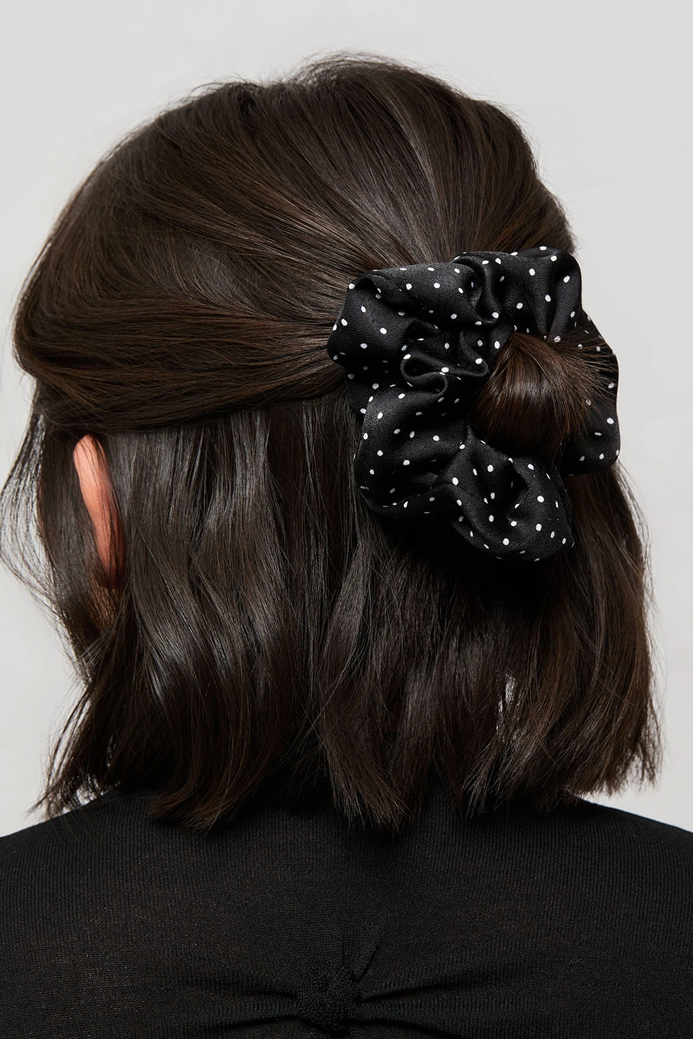 Svart scrunchie i sidenimitation med vita prickar i gruppen Håraccessoarer / Scrunchies hos Glitter (332001629400)