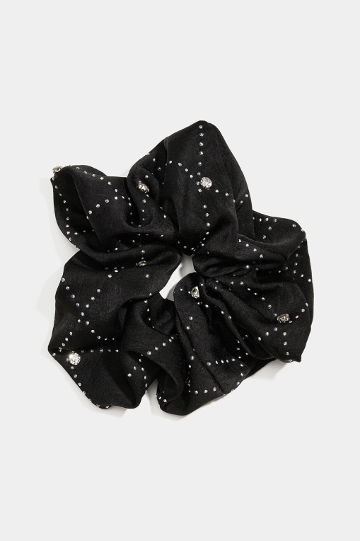 Stor scrunchie i glansigt svart tyg dekorerat med små nitar och vita stenar.
