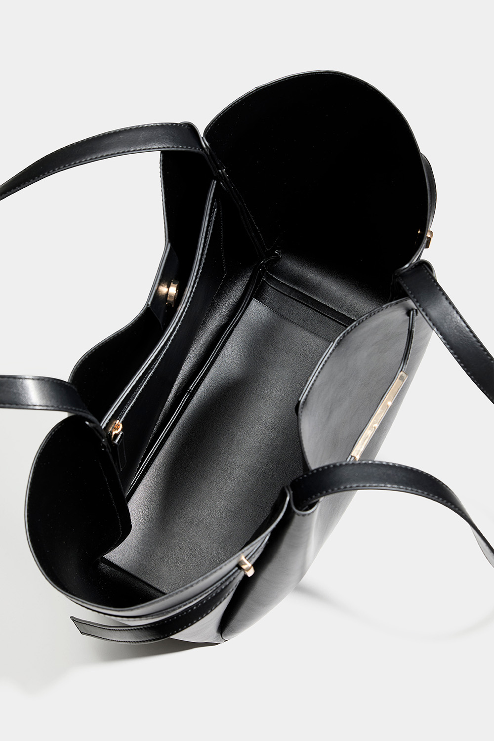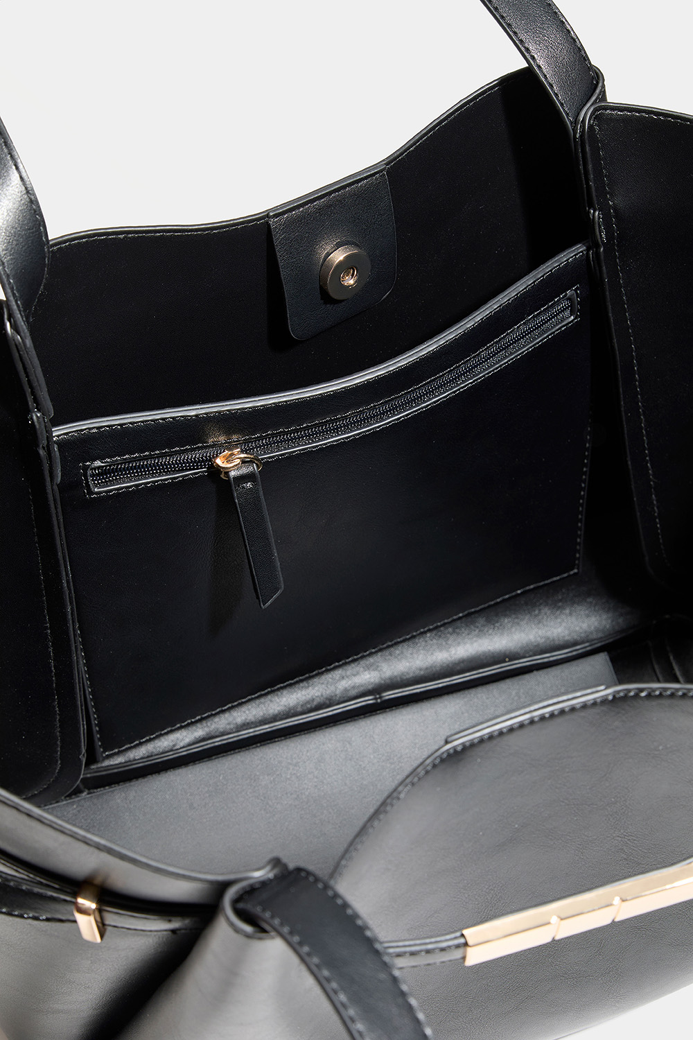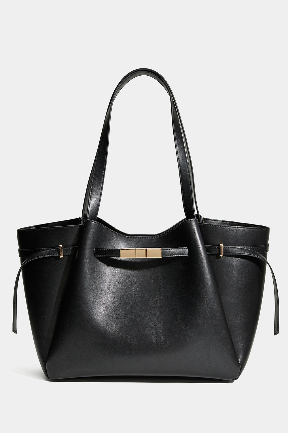 Stor shopperväska i svart läderimitation med bältdetalj med guldfärgad metall. Väskan har ett stort fack som stängs med magnet och ett mindre fack med dragkedja.