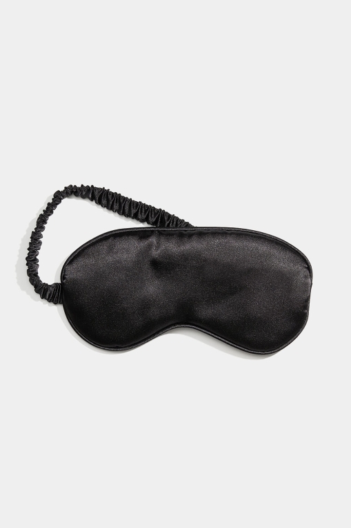 Lått vadderad sovmask i svart satin med elastiskt band som fästs runt huvudet.