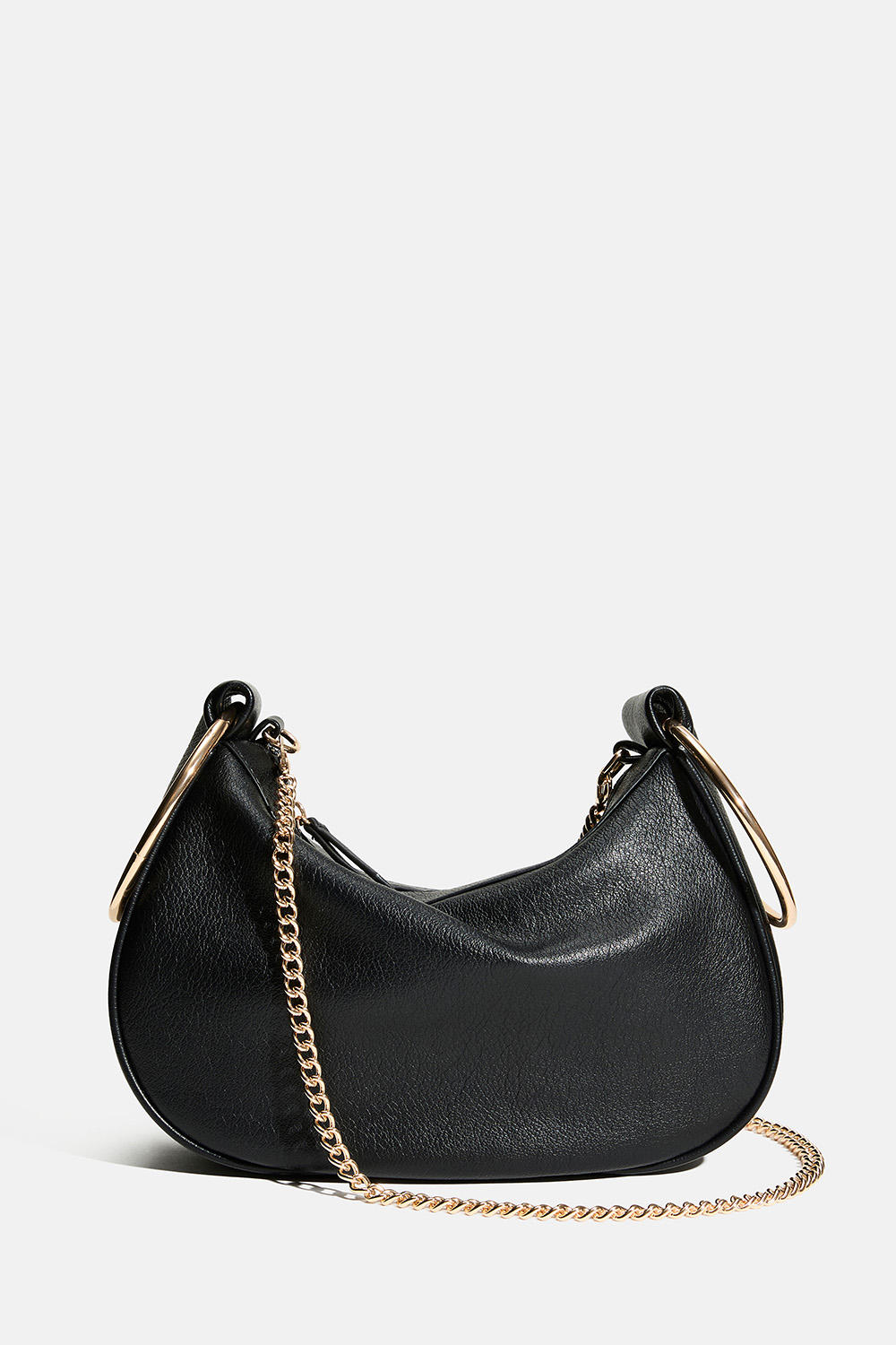 Väska i mjuk svart imitationsskinn med två ringar i metall. Väskan har ett stort fack och ett mindre fack på insidan. Det medföljer en avtagbar kedjerem.