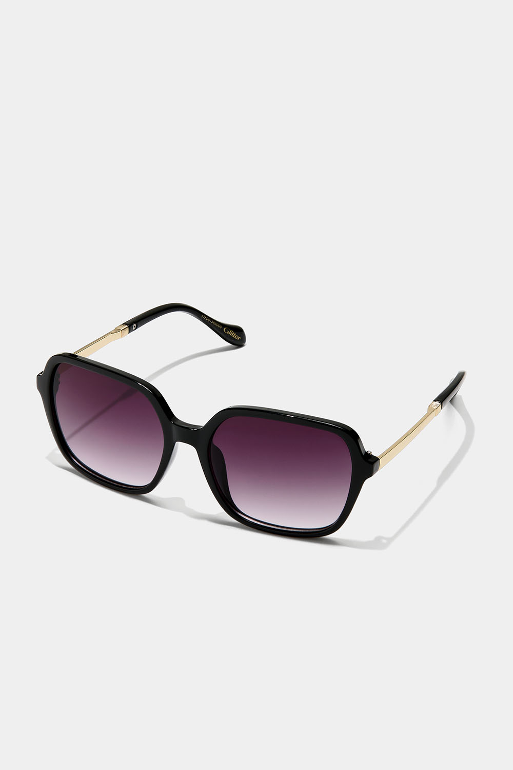 Svarta, retro-inspirerade, fyrkantiga solglasögon med rundade hörn och lilatonade glas. Bågarna är svarta och skalmarna till hälfen i guldfärgad metall.