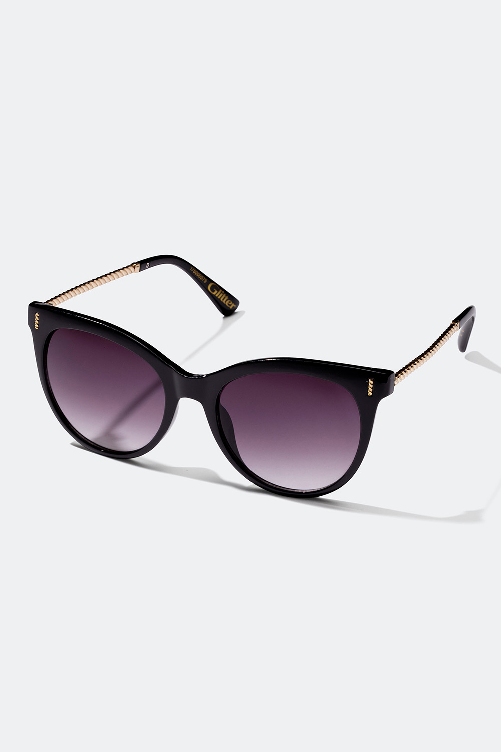 Solglasögon med rundade svarta bågar och mörkt tonade linser. Solglasögonen är dekorerade med guldfärgade detaljer på bågarna och skalmarna kommer i tvinnad guldfärgad metall.