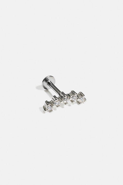 Traguspiercing med platt bakstycke i kirugiskt stål med en böjd stav dekorerad med Cubic Zirconia stenar. Piercingen ska sitta i det lilla broskstiftet framför hörselgången, men går att använda i andra öronpiercings, så som i helix.