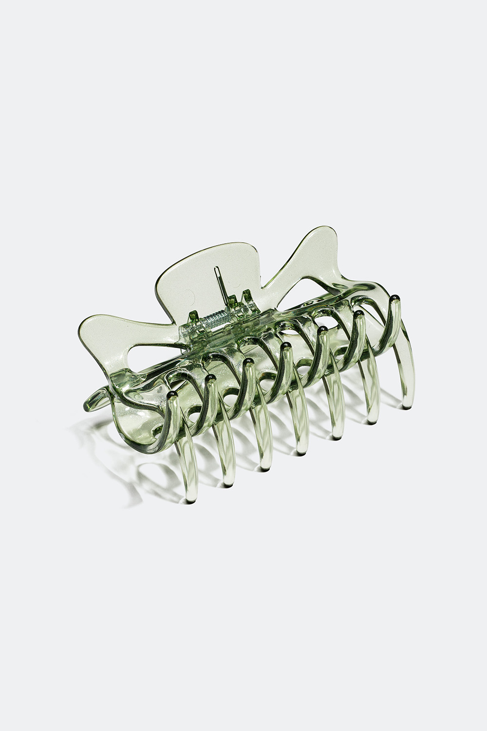 Hårklämma i en grön genomskinlig färg som har ett lätt skimmer. Klassisk håraccessoar som skonsamt och enkelt håller håret på plats i en halv- eller heluppsättning.