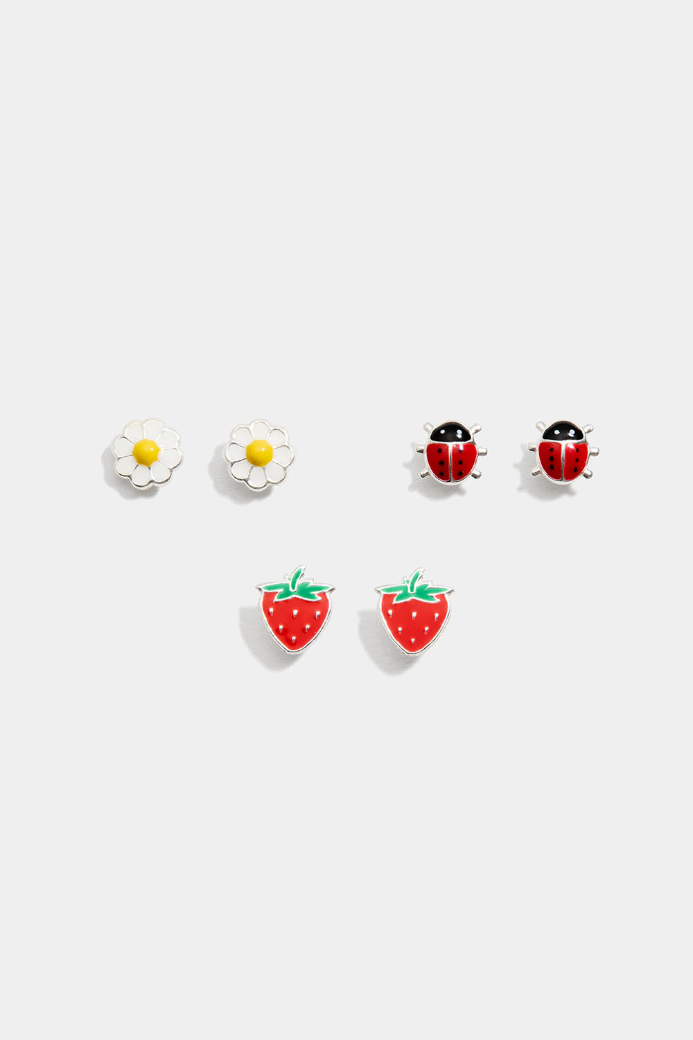 Tre par örhängen i äkta silver med somriga motiv av jordgubbar, nyckelpigor och prästkragar.