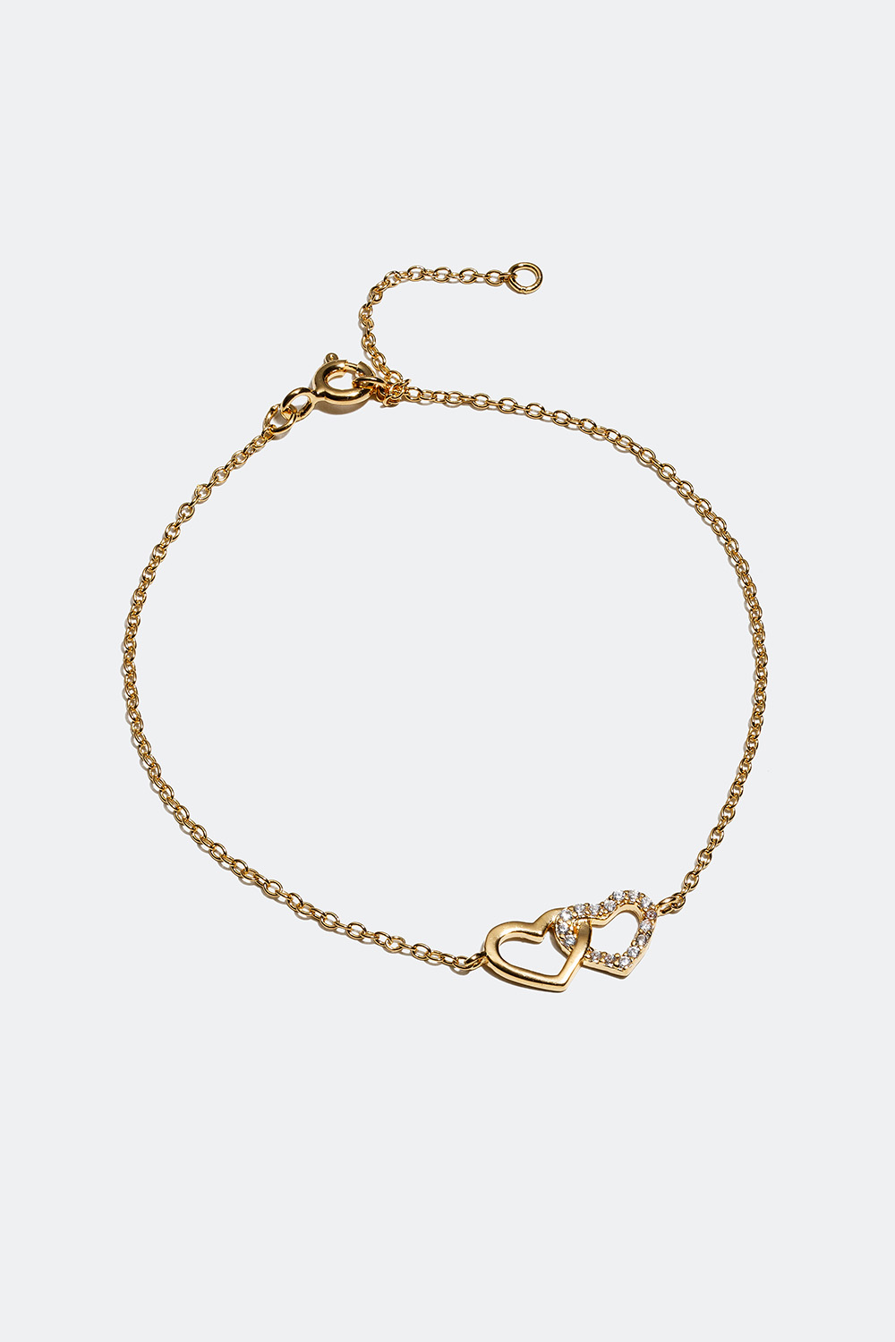 Armband i äkta silver förgyllt med 18 karat guld med tunn kedja och två ihopsatta hjärtan, varav ett är dekorerat med skimrande Cubic Zirconia stenar. Armbandet är 19 cm lång, men har en extra ögla vid 16 cm om man behöver ett kortare armband.