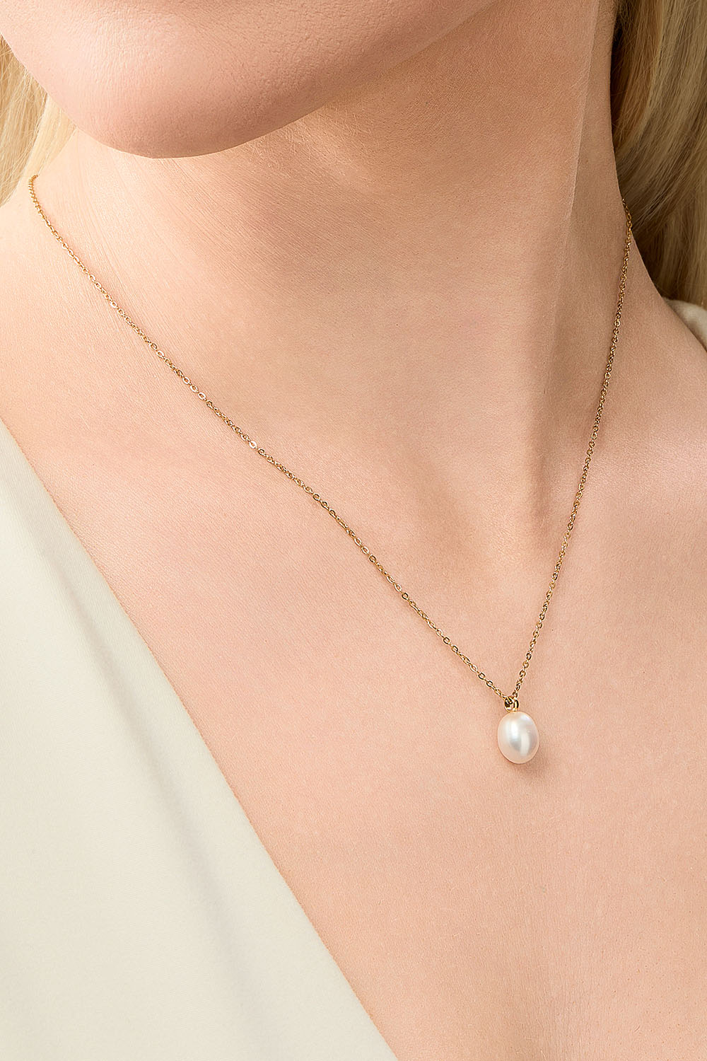 Tunt kedjehalsband i högpolerat rostfritt stål som är PVD-pläterat med 18K guld, med en stor hängande sötvattenspärla.