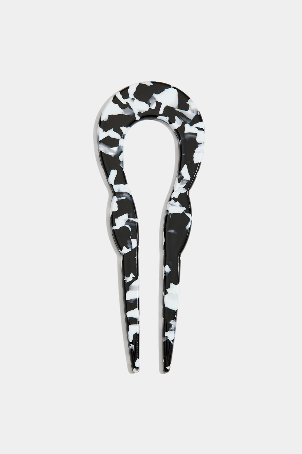 En svart-vit, u-formad fransk hårnål i resin.