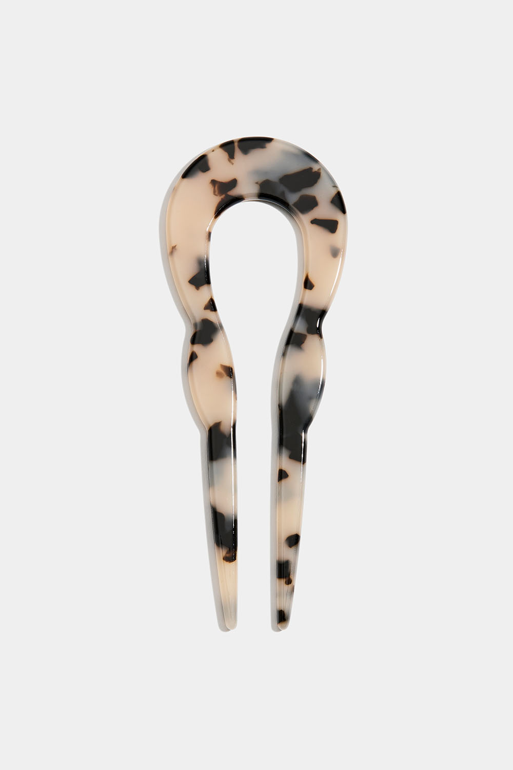 En tortoise mönstrad, u-formad fransk hårnål i resin.